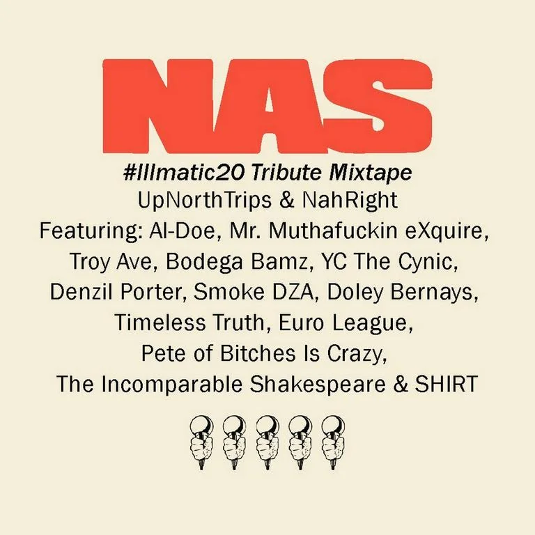 To celebrate the 20th anniversary of Nas' classic debut album Illmatic, I teamed up with my colleagues at NahRight, UpNorthTrips, and Blame The Label to release a tribute mixtape featuring modern-day New York MCs rapping over classic Illmatic instrumentals. It was an idea birthed from a brainstorm session with my close friend Evan Auerbach at UNT, who executive produced the project with me. The tape was picked up by every major hip-hop site you can think of, and remains an important piece of the Illmatic legacy. Thank you Nas for the inspiration. See cover above and promo art below, then listen to the project in full.